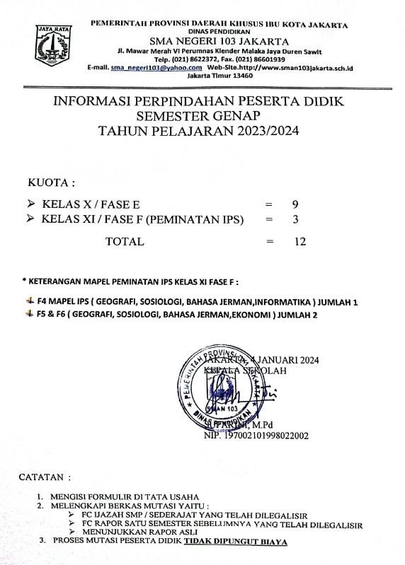 SMA Negeri 103 Jakarta membuka Perpindahan (Mutasi) Peserta Didik Semester Genap Tahun Pelajaran 2025/2026 sesuai...